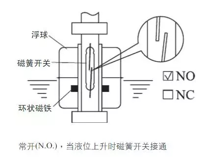 利用浮球內(nèi)的磁鐵去吸引磁簧開(kāi)關(guān)的接點(diǎn),產(chǎn)生開(kāi)與關(guān)的動(dòng)作,作液位的控制或指示。下圖為常閉(NC)及常開(kāi)(NO)時(shí)浮球開(kāi)關(guān)的相關(guān)位置