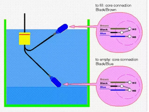 使用棕色和藍(lán)色的電線:浮球在上液位時(shí),接點(diǎn)是接通的狀態(tài)。浮球在下液位時(shí),接點(diǎn)是不通的狀態(tài)。