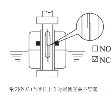 利用浮球內(nèi)的磁鐵去吸引磁簧開關(guān)的接點(diǎn),產(chǎn)生開與關(guān)的動作,作液位的控制或指示。下圖為常閉(NC)及常開(NO)時(shí)浮球開關(guān)的相關(guān)位置