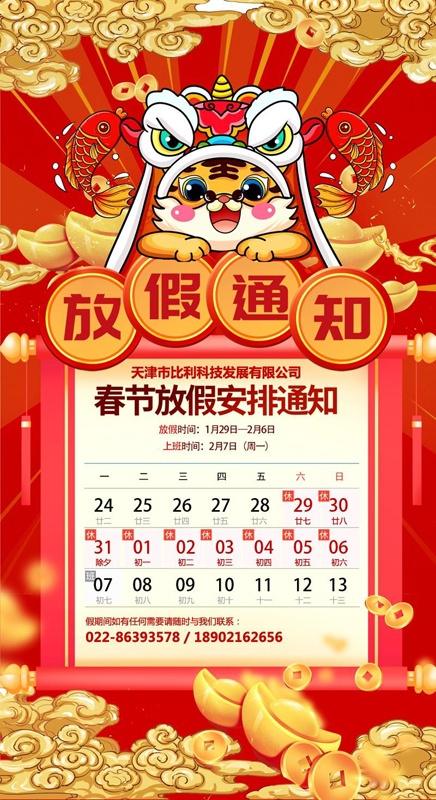 在此,感謝大家在過去一年里對比利科技的支持與信任。同時也希望在新的一年里,比利能繼續(xù)得到大家的關注及支持,并且比利也會一如既往地為大家提供更優(yōu)質的服務!正值中國的傳統(tǒng)節(jié)日“春節(jié)”來臨,在此向各位新老客戶和廣大朋友們拜個早年!預祝大家新春愉快!財源廣進!事業(yè)紅火!