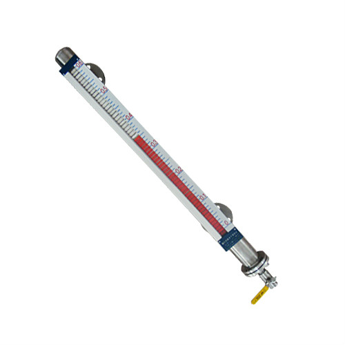 磁翻板液位計(jì)(也可稱為磁性浮子液位計(jì))根據(jù)浮力原理和磁性耦合作用研制而成。在與容器連接的連通管內(nèi),浮筒隨管內(nèi)的液面上升、下降從而反映容器的液位變化,然后通過(guò)浮簡(jiǎn)內(nèi)的磁鋼,將液位的變化傳輸?shù)郊t、白指示反光柱上。液位上升時(shí),紅半螢光柱連續(xù)翻向外面,液位下降時(shí),白半反光柱連續(xù)翻向外面。根據(jù)紅半反光柱指示的液位高度讀出具體數(shù)值。